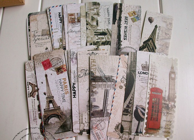 30 pc vintage postcard style bookmarks with world famous tourist attractions, mainly in London and Paris.