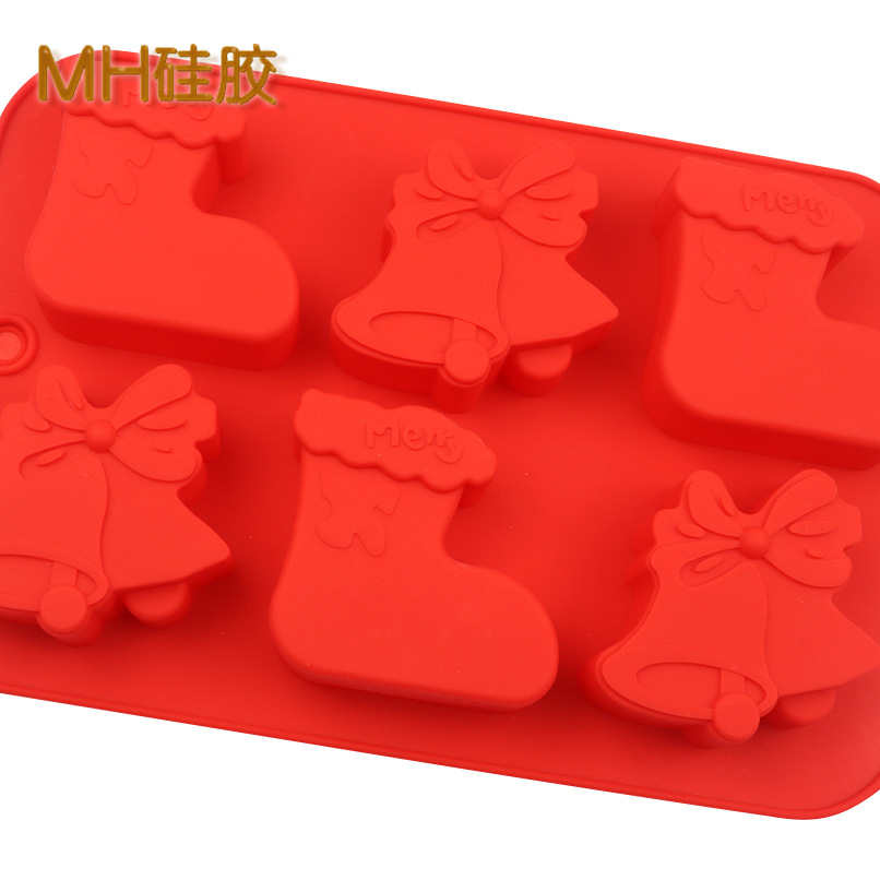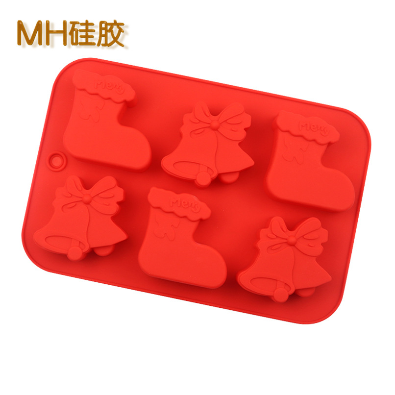 Christmas Stockings and Bells (Red): 6 x cavity. the mould measures approximately 25cm x 17cm, and each cavity is about 7cm in length, 6.5cm in width and 2.5cm in depth.