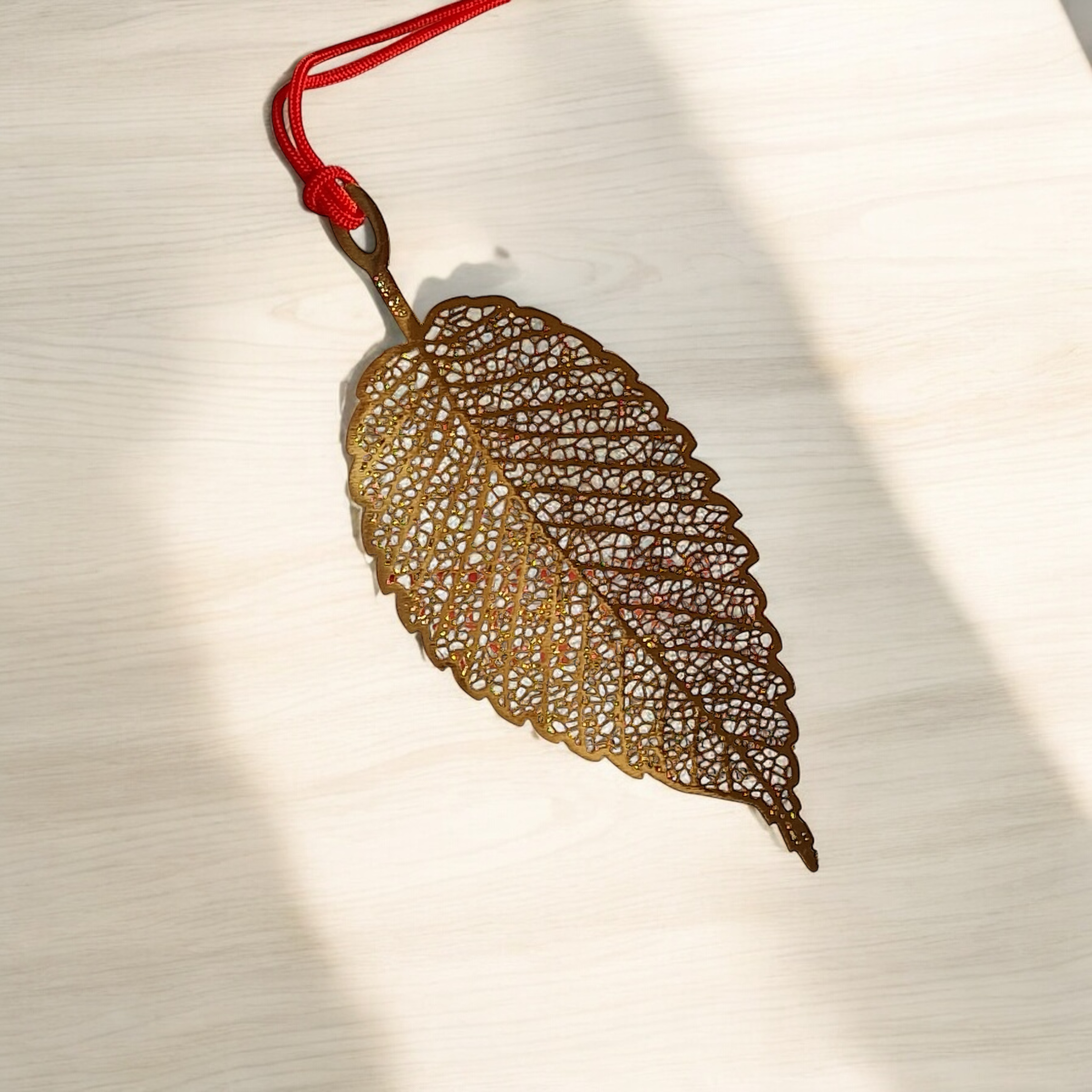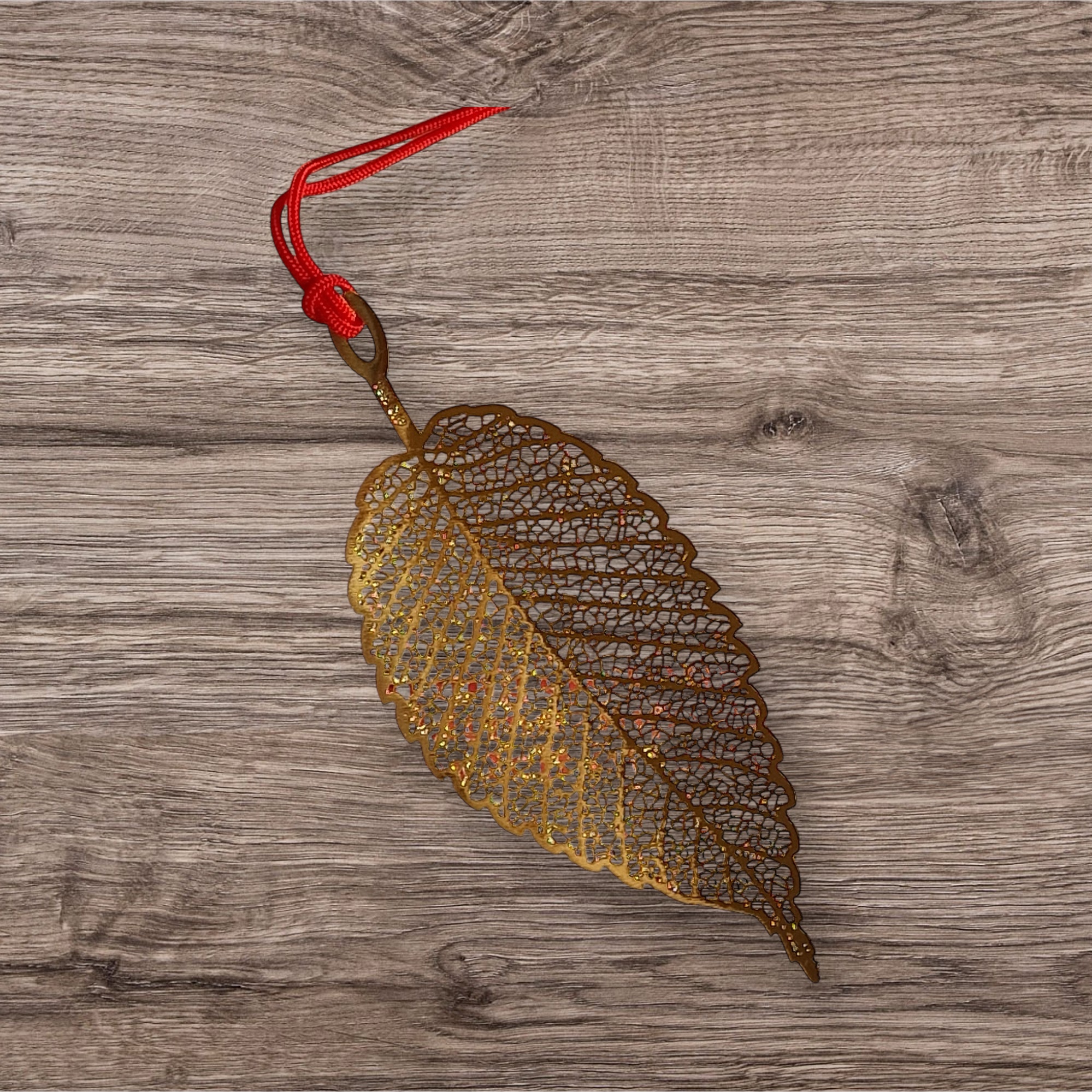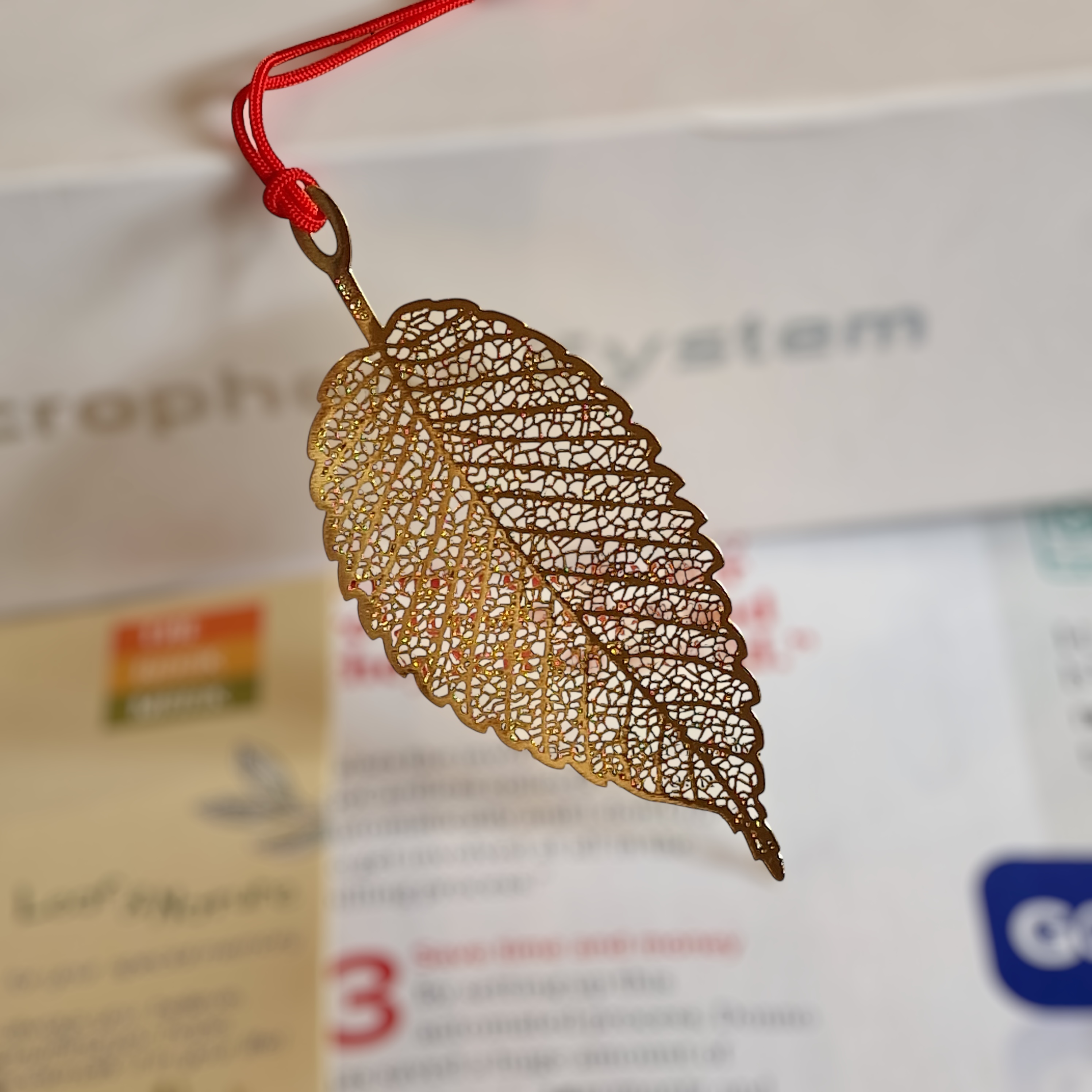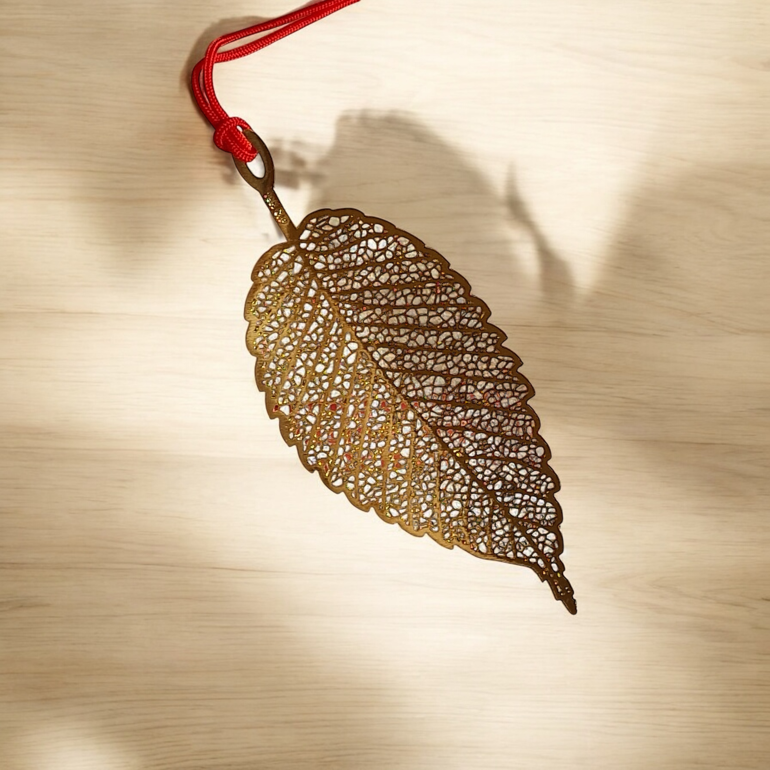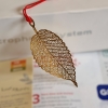 Sparkling gold metal bookmarks in the designs of leaves.