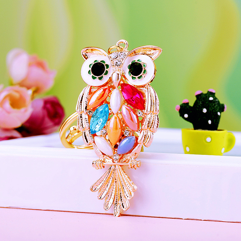 A very attractive design in colourful gold owl with sparkling crystal diamante rhinestones. This bag charm / handbag keyring is a very unique gift for your loved one on special occasions.