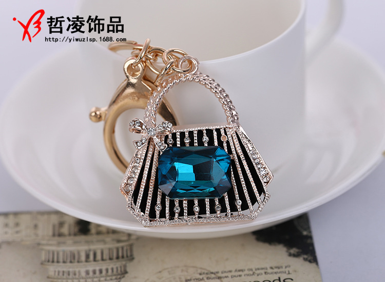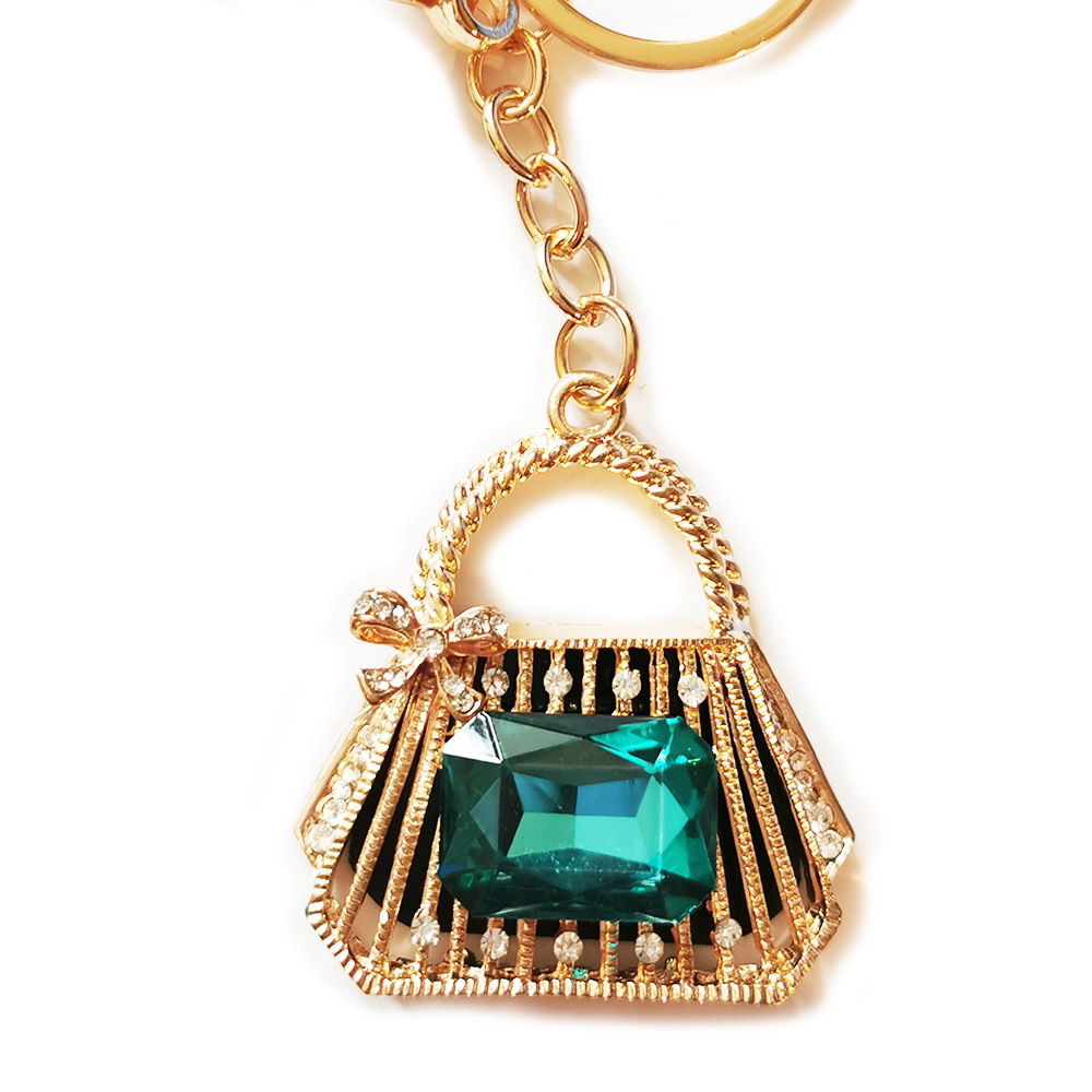 Luxury bag charm in the design of a fashion ladies handbag decorated with a large blue or green rhinestone.