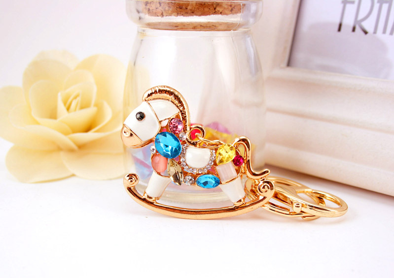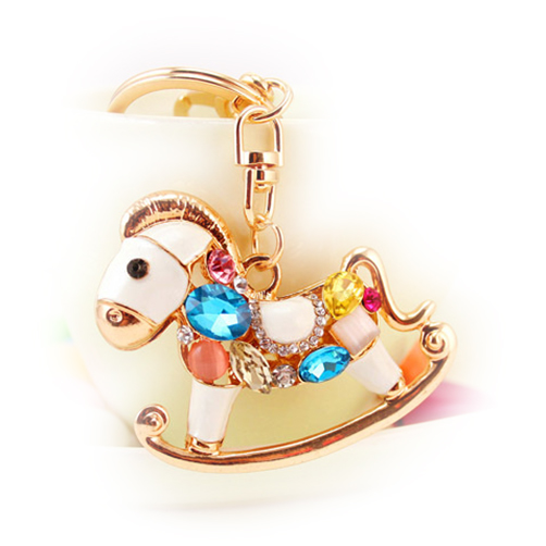White rocking horse with colourful gemstones bag charm handbag pendant keyring key chain