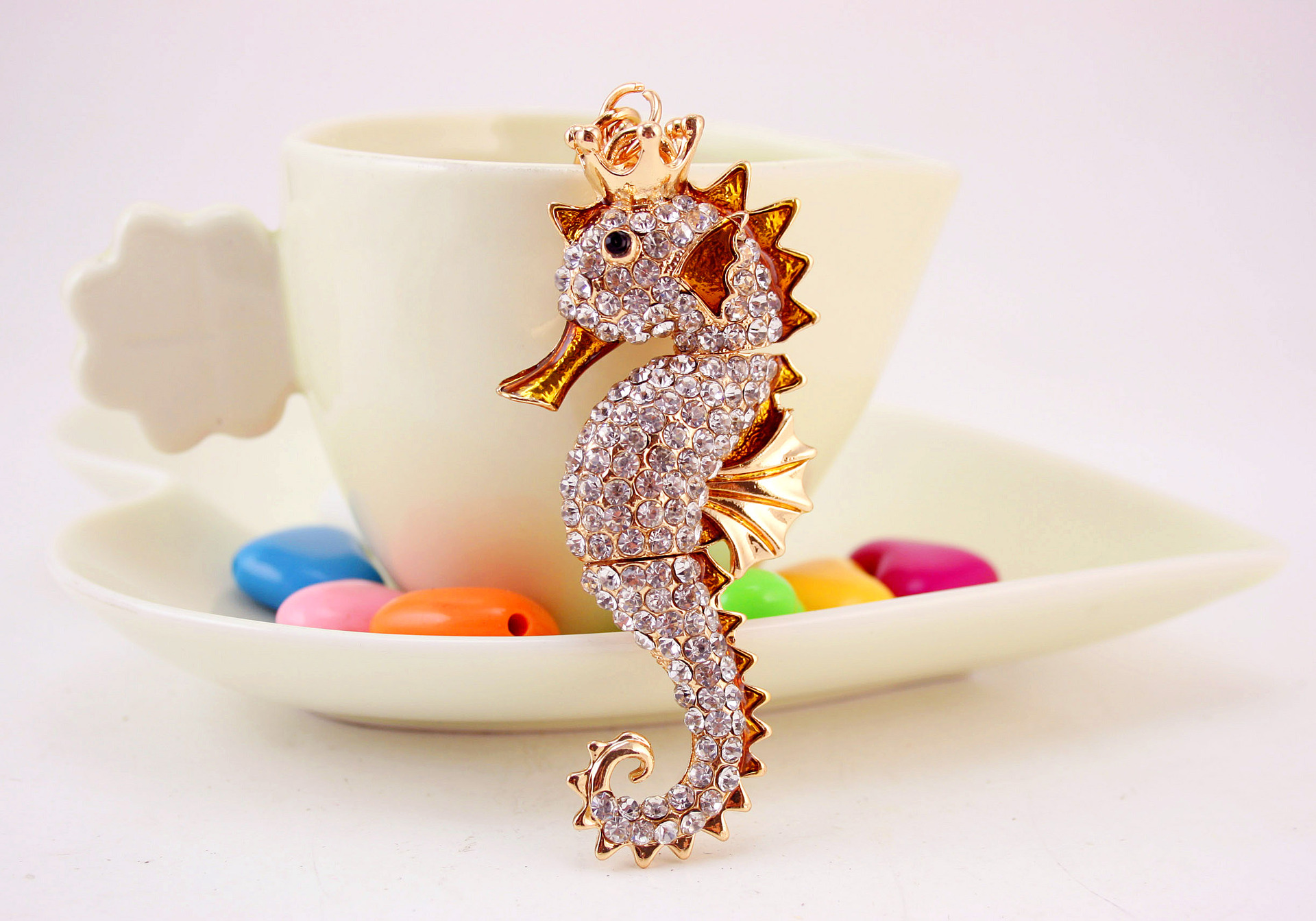 A very attractive design in colourful seahorse with sparkling crystal diamante rhinestones. This bag charm is finished in great detail. This bag charm / handbag keyring is a very unique gift for your loved one on special occasions