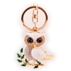 White owl standing on tree with green leaves, decorated with sparkling crystal diamante rhinestones, bag charm handbag keyring key chain