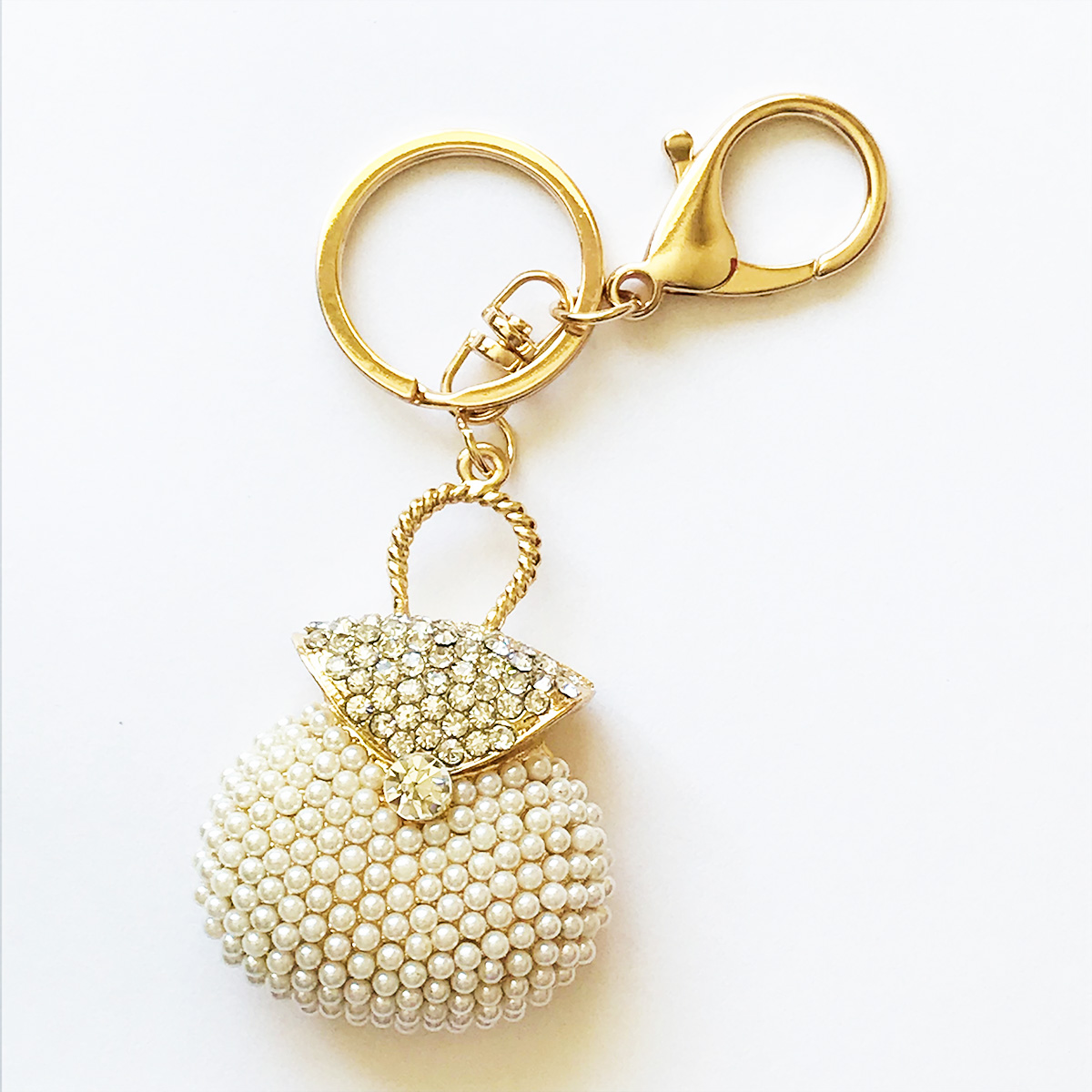A very unique bag charm handbag keyring in the design of a luxury ladies handbag decorated with white pearls and sparkling crystal diamantes.